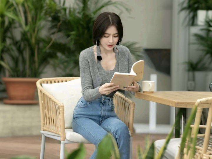 再看另一张,她侧着身,眼神望向远处,那沉静样儿迷死个人。皮肤紧致透亮,曲线玲珑,哪像奔五的人?分明是二十出头的小姑娘!她坐在藤椅上,捧着本书,旁边绿植环绕,杯子还冒热气,岁月静好不过如此吧?