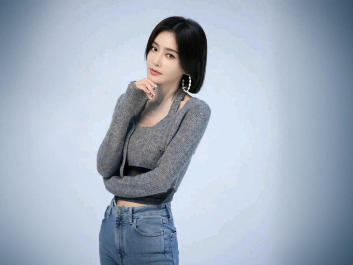 瞅她那一身,灰毛衣外套松松垮垮,里头搭个小背心,腰线儿咔一下就显出来了。配上条经典牛仔裤,简单又时髦。短发利利索索,大耳环晃呀晃的,整个人闪闪发光。她往那儿一坐,托着下巴,眼神温柔带笑,哎哟,心都要化了!