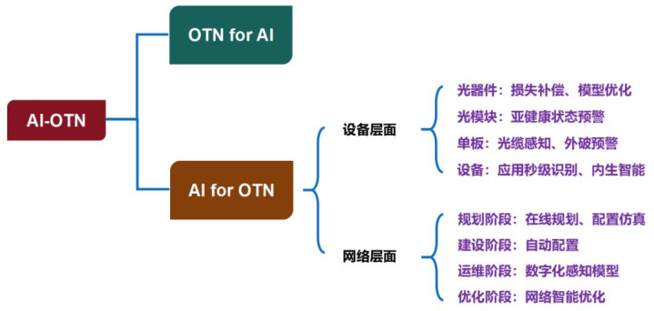 AI-OTN,顾名思义,就是在传统OTN的基础上,针对AI时代的新场景、新需求,进行全面升级演进,从而发展出的新型OTN网络。它包括了两大战略方向,即:“OTN for AI”以及“AI for OTN”。