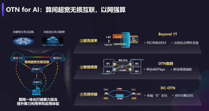 在算间场景(智算中心之间的互联互通),AI-OTN可以通过Beyond 1T、OTN集群、DC-OTN等创新技术,实现算力资源的超宽无损互联,有效打破算力孤岛。