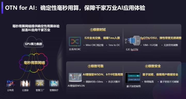 在入算场景(用户与智算中心之间的互联互通),AI-OTN可以通过端到端全光交换、AI增强型WSON、fgOTN细颗粒调度及量子加密等先进技术,为用户提供极致低时延、高可靠、高安全的“毫秒用算”体验。
