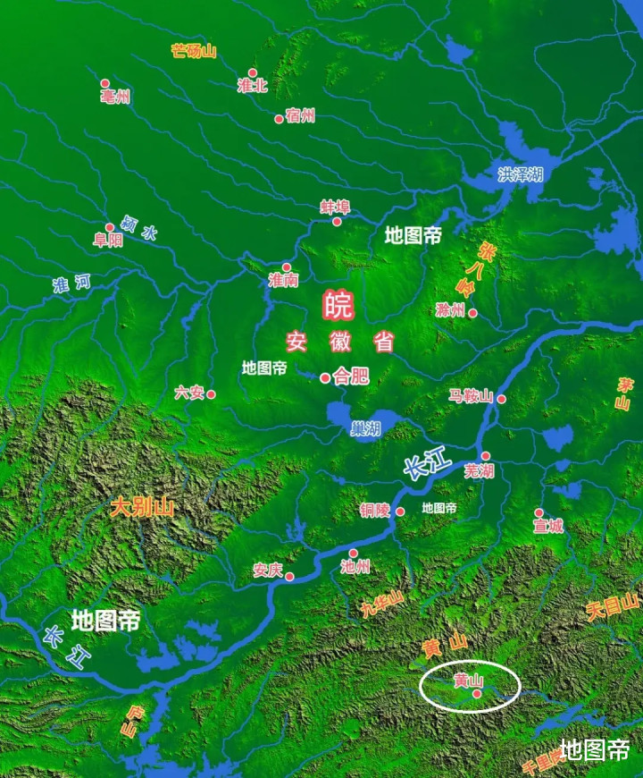 安徽北部的淮北、宿州、亳州属淮北,是暖温带半湿润季风气候,地形一马平川,典型的中原文化圈,方言为中原官话,主食以面食为主;南部的黄山属江南,是亚热带季风气候,地形山峦叠嶂,是徽州文化区,方言为徽语,主食以米饭为主。