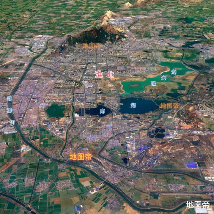 淮北市区大致为新濉河、乾隆湖、南湖、绿金湖围成,城区海拔30-70米,市中心纬度是北纬33°57′23″。