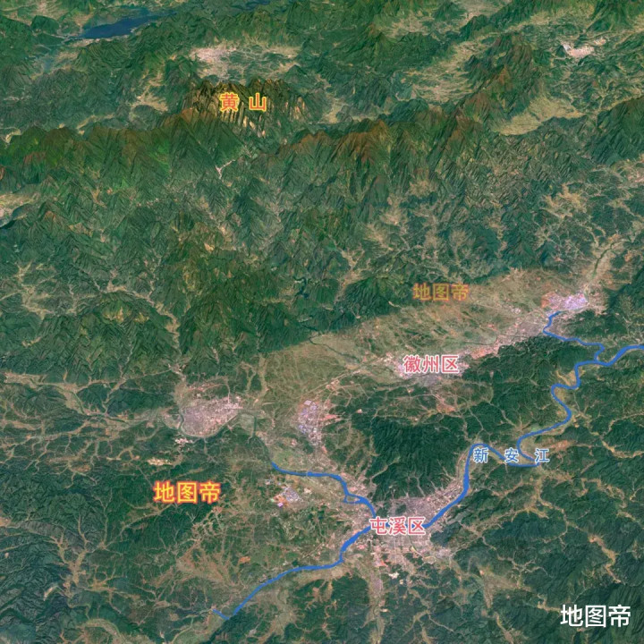 黄山市的徽州区和屯溪区,中间有山脉阻隔,分属徽州盆地和屯溪盆地。徽州区在丰乐河上,徽州古城在歙县丰乐河汇入练江处,练江向东南汇入新安江。屯溪区在横江与率水交汇城新安江处,城区海拔120-130米,市中心纬度是北纬29°42′53″。