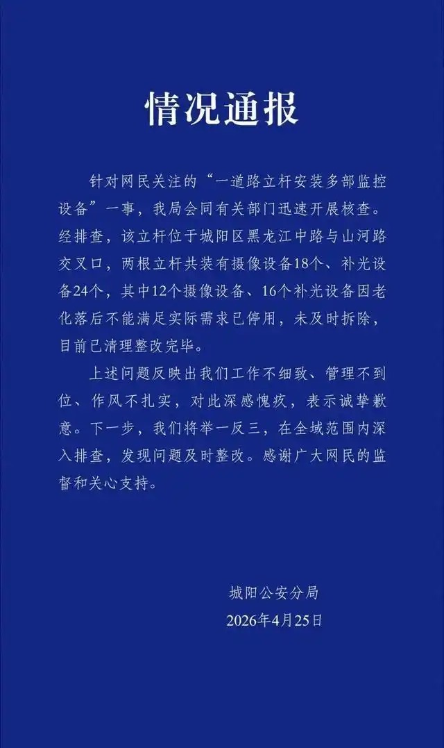 针对网民关注的“一道路立杆安装多部监控设备”一事,我局会同有关部门迅速开展核查。经排查,该立杆位于城阳区黑龙江中路与山河路交叉口,两根立杆共装有摄像设备18个、补光设备24个,其中12个摄像设备、16个补光设备因老化落后不能满足实际需求已停用,未及时拆除,目前已清理整改完毕。
